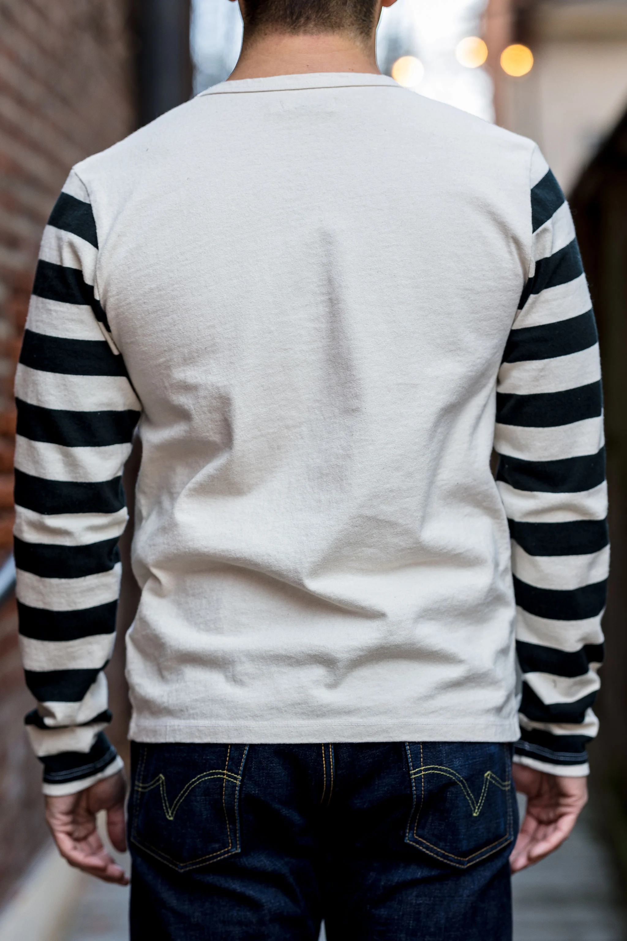 The long awaited Freenote Shifter Striped Long Sleeve is back! Combining vintage a motorcycle striped sleeve look with the ultra popular Freenote heavyweight 13oz fabric, the Shifter long sleeve combo will have you searching for an old Harley to go with your tee.