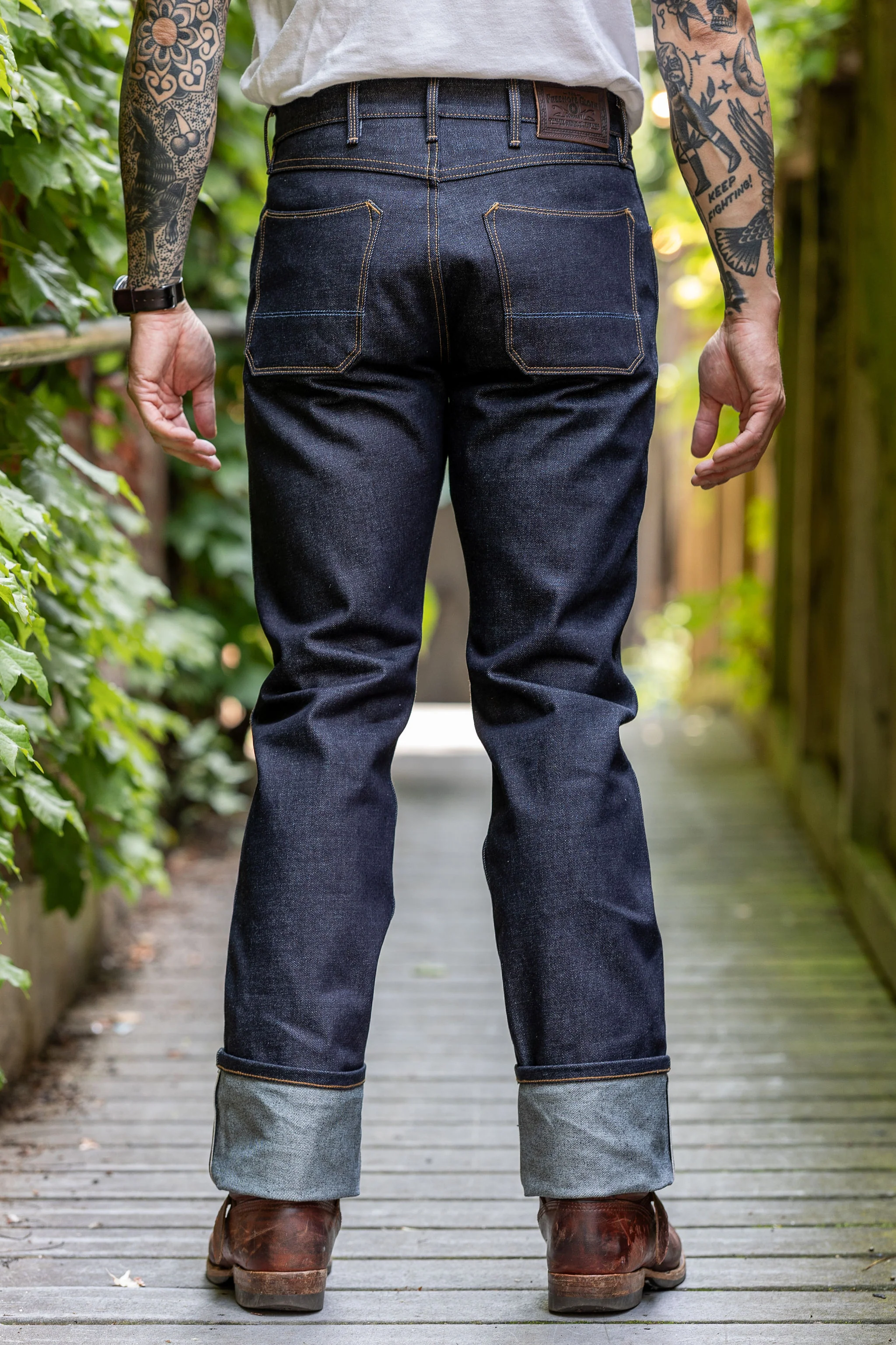 What's a western fit you ask? It's the type of denim that sits higher and has enough room in the top block so you can throw your leg over a horse (or motorcycle) freely and hides that plumber's crack when sitting. It's also got enough room in the leg opening for a cowboy (or engineer) boot, but the leg is slim enough to look good on the dance floor. Putting all that together, the Wilkes sits up higher and is a not-too-full straight leg where you can comfortably fit over a boot. It's one of our favorite new fits for its clean look and functionality.