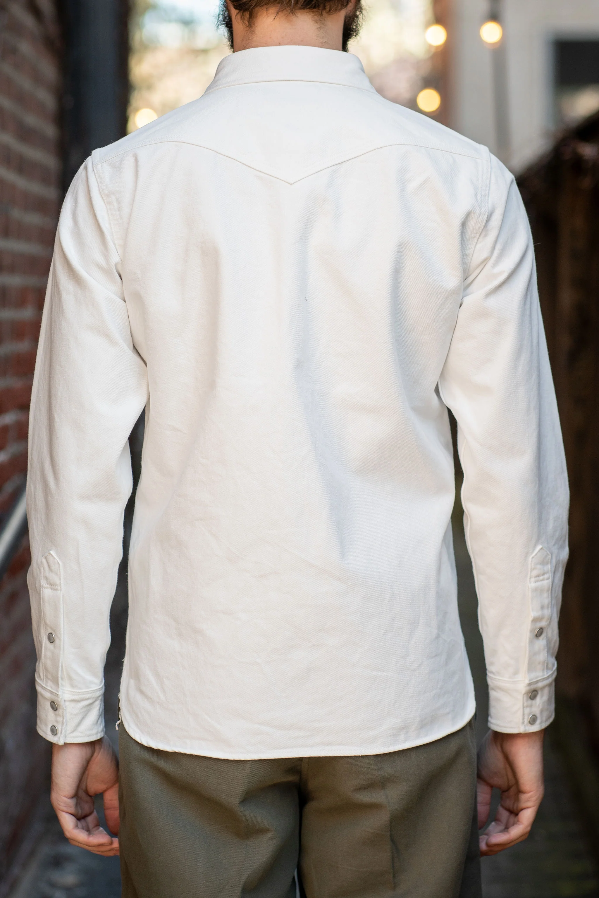 The classic Iron Heart Western now comes in a 13.5oz white denim, with an open-ended 70s/80s style fabric. This shirt goes all-in on white, with heavy-duty pearl snaps, tonal stitching, and white bobbin thread with a chainstitch runoff. This shirt can be saved for the very special occasions, but it's also meant to have its sleeves rolled up and worn hard, developing a ware unique to you.