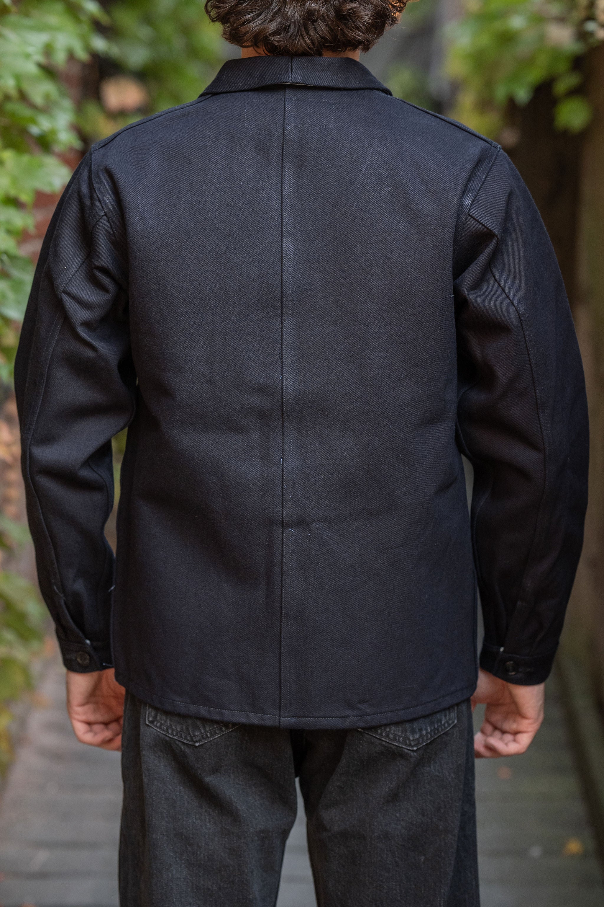 This work jacket from Mister Freedom’s “Sub-Mariner” collection is constructed from their beloved 16oz “Midnight” denim (indigo warp, black weft), and sits with a boxy, unstructured fit that cuts off squarely at the hip. The cut is inspired by 60s/70s Swiss workwear, while the pincheck pattern in the accents is inspired by a pair of USN trousers from the 1920s. Unlined and unsanforized, this is an ideal piece for layering, and will look fabulous after a few beatings.
