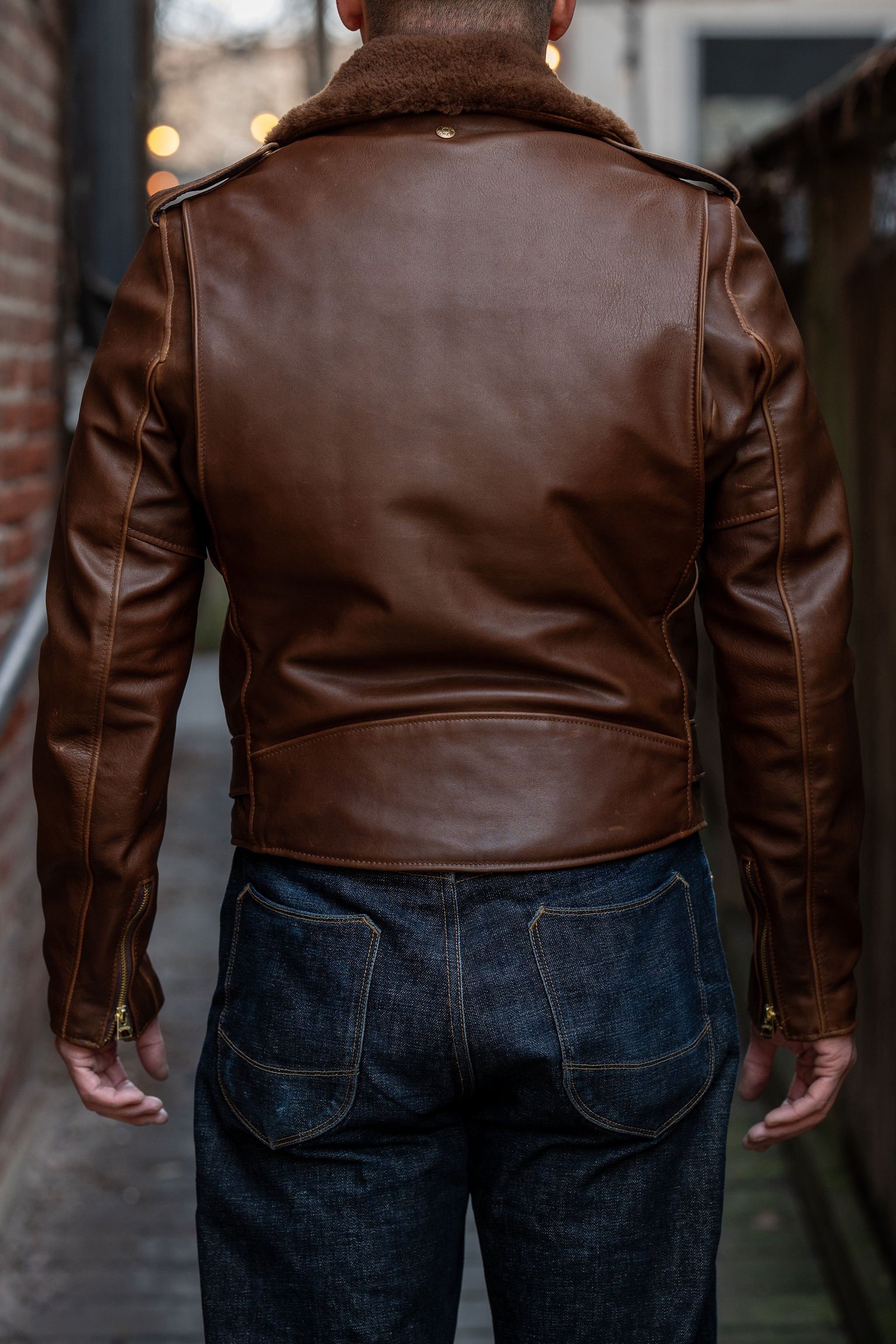 A classic Schott Perfecto double-rider in a beautiful chocolate brown Horween horsehide leather, need we say more? Designed with a traditional cropped silhouette for motorcycle riding, this iconic Perfecto jacket embodies effortless cool and enduring quality. Unlike typical horsehide that requires years to soften, this jacket is made of a specially developed Chromexcel leather from Chicago’s renowned Horween Tannery, delivering an incredibly soft, buttery feel without compromising on durability. Built to stand the test of time, the P656H Perfecto seamlessly blends heritage craftsmanship with modern wearability. Complete with a detachable sheepskin collar and a striking gold diamond-quilted lining, this jacket ensures warmth and sophistication, making it the ultimate companion for crisp winter rides or year round wearability.
