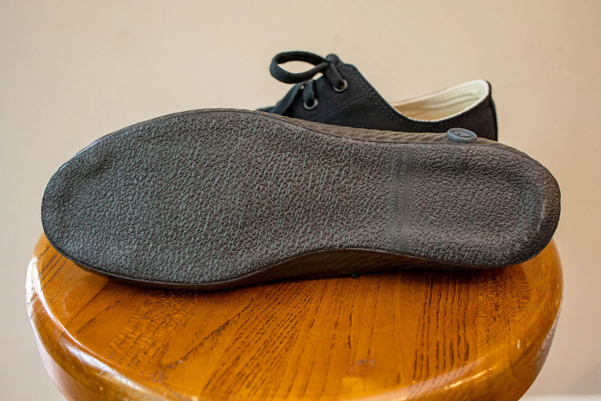 The Shoes Like Pottery Low Top Sneakers are as understated as they are beautiful. Their beauty lies not in flashy colors or trendy materials, but in the handmade construction of every pair. Unlike most Shoes Like Pottery, these bad boys come in full black, since you don't always need a pop of contrast at the toe. The canvas upper is sewn together then glued to the outsole with a tape made of natural rubber in a process that can't be done by machine. It must be done by hand. Once the upper is cemented to the outsole, the whole shoe is fired in a kiln for 70 minutes in a process known as ka-ryu. This process causes the sulfur in the outsole to react, returning the natural rubber to its original state and creating an outsole that is soft, flexible and durable. This process is very similar to how Japanese pottery is made and the result is a simple, timeless sneaker that will last for years.